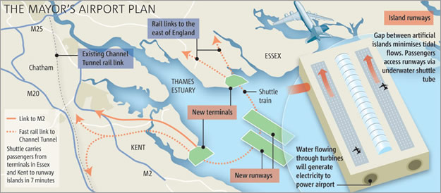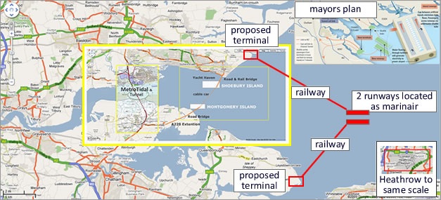 mayors airport plan The mayor’s scheme has two airport terminals; one each in Kent and Essex connected to a man made airport in the estuary by (approx) 30km of tunnel (10km to Kent & 20km to Essex) and shuttle trains under the estuary. By comparison, the Channel Tunnel is approximately 40km.