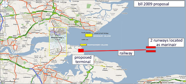 bll 2009 proposals The Bll airport proposal with its single terminal on Grain and North to South road and rail infrastructure extension is more efficient than the latest proposals in the domain. It would be cheaper to build, easier to connect to existing road and rail networks and needs only one tunnel out to the airport. It will also integrate well with the Bll design competition.