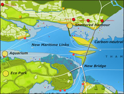 3. Sir Terry Farrell proposals In 2003, architect & master planner, Sir Terry Farrell CBE, conceived an aspirational vision to declare the Thames Gateway as a new kind of National Park. Although he had no official position and his initiative was voluntary, his proposals attracted a group of backers including the Bank of Scotland, Experian & the Future Foundation. The scheme with its huge bridge snaking all the way from Shoeburyness in Essex to Sheerness in Kent was presented to Ruth Kelly in 2008. Sir Terry was appointed Thames Gateway Parklands design champion last year by then housing minister Yvette Cooper and commissioned to produce a plan for the region.