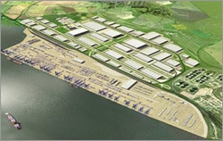 London Gateway Port The London Gateway deep sea container port will become Europe's largest logistics park, with 9.5 million sq ft for the distribution, manufacturing & high-tech sectors. It will provide capacity for 3.5 million cargo units a year and be a hub for the world's largest container ships with a 2.3 km container quay with seven deep water container vessel berths. It will be built on the north bank of the River Thames near Thurrock, Essex, on the site of the former Shell Haven oil refinery by Dubai Ports. |